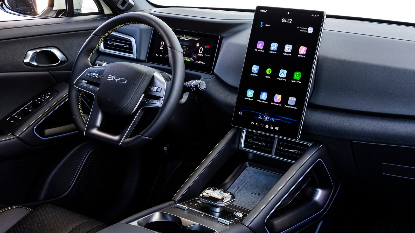 Στο εσωτερικό υιοθετούνται τα γνώριμα αιχμηρά σχεδιαστικά μοτίβα της BYD, που συνδυάζονται με υψηλή ποιότητα κατασκευής και πλούσιο εξοπλισμό. Κυρίαρχο στοιχείο στην καμπίνα είναι η περιστρεφόμενη κεντρική οθόνη αφής των 10,1 ή 12,8 ιντσών (ανάλογα με την έκδοση), ενώ τα υλικά και ο φωτισμός του εσωτερικού δημιουργούν μια premium αίσθηση. Οι χώροι είναι ιδιαίτερα ικανοποιητικοί για πέντε επιβάτες, με εκείνον των αποσκευών να φτάνει σε χωρητικότητα τα 400 λίτρα.
